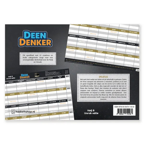 Deen Denker: Hadj & Umrah Editie is een leuk en leerzaam kennisspel waarin spelers hun creativiteit én kennis over de bedevaart inzetten. Het spel bevat 32 verrassende categorieën die allemaal te maken hebben met de Hadj en Umrah. Zodra de letter gekozen is, probeert iedereen binnen 2 minuten alle categorieën op zijn speelblad in te vullen.