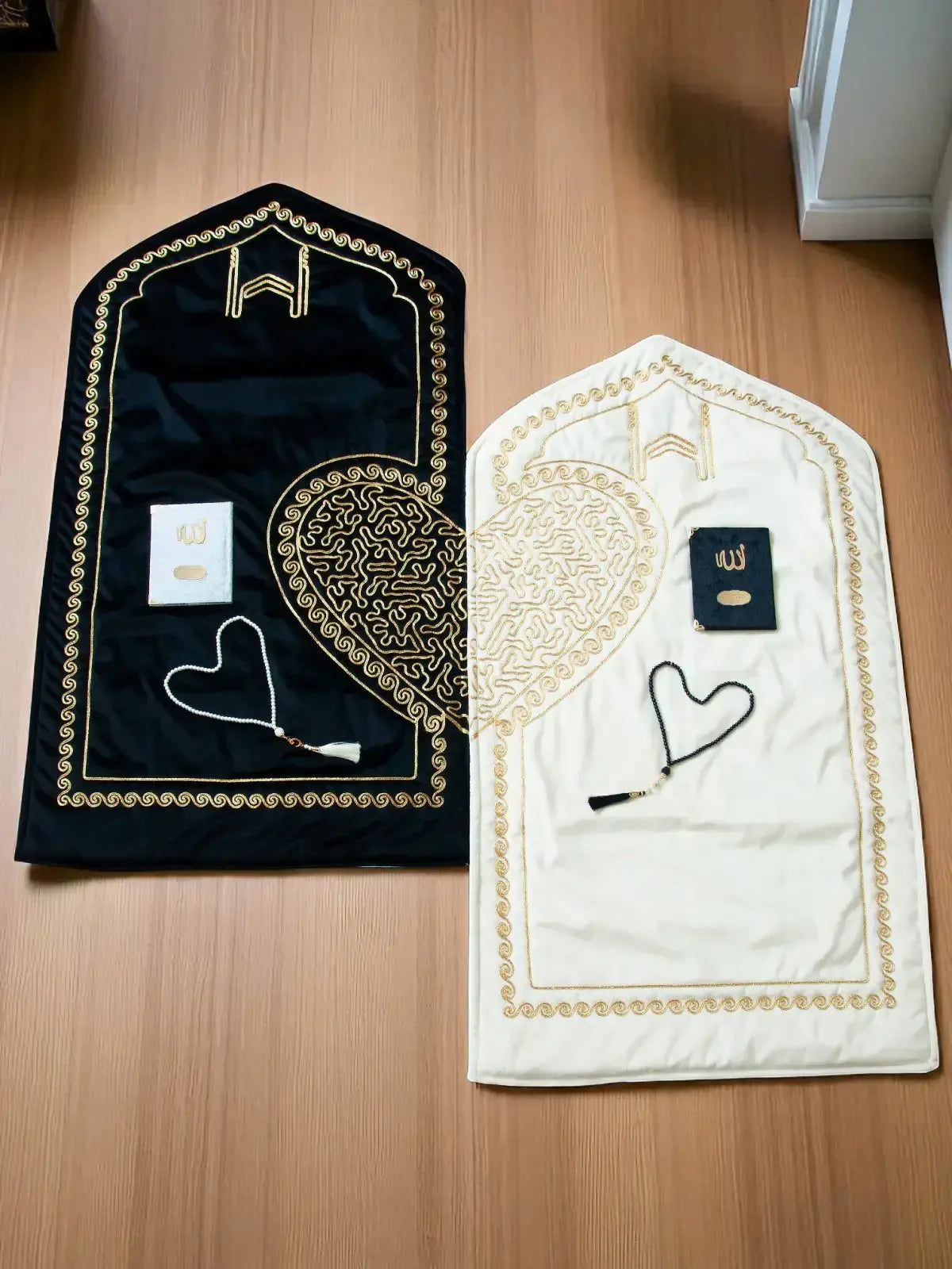 Geef je speciale gelegenheden een vleugje elegantie en spirituele waarde met deze exclusieve set voor koppels. Deze luxe dubbele gebedsmatten zijn met zorg ontworpen voor bruids- en bruidegom-geschenksets. Vervaardigd uit hoogwaardig fluweel, bieden ze een zijdezachte textuur gecombineerd met stijlvolle goudkleurige hartmotieven. Een betekenisvol geschenk dat luxe en traditie perfect verenigt.