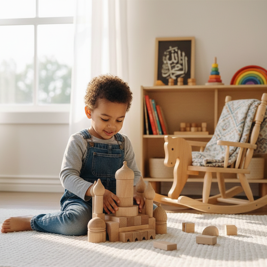 Met deze blokkenset kunnen kinderen de vormen van een moskee herkennen en nabouwen in hun eigen speelhoek. De set bevat verschillende houten elementen, zoals koepels, bogen en pilaren, waarmee de islamitische architectuur op een eenvoudige manier onderdeel wordt van hun spel.