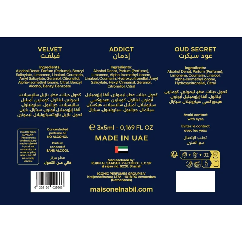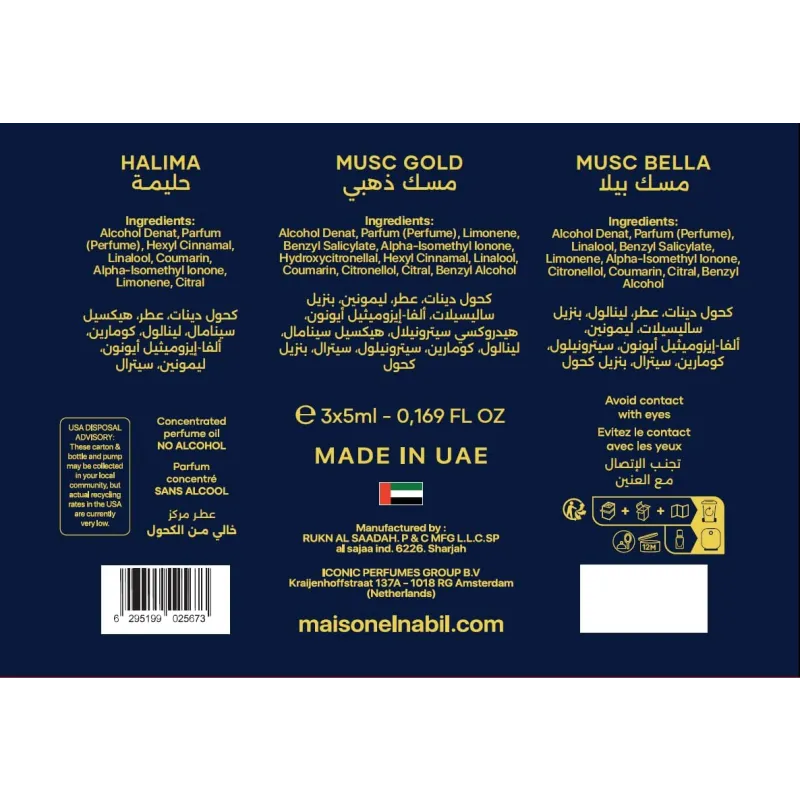 Ontdek de verfijnde geurwereld van Maison El Nabil met de Musc Collection Giftsets. Elke giftset bevat drie zorgvuldig geselecteerde parfumoliën van 5 ml, perfect om verschillende geurprofielen te ontdekken of om cadeau te geven aan een echte geurliefhebber.