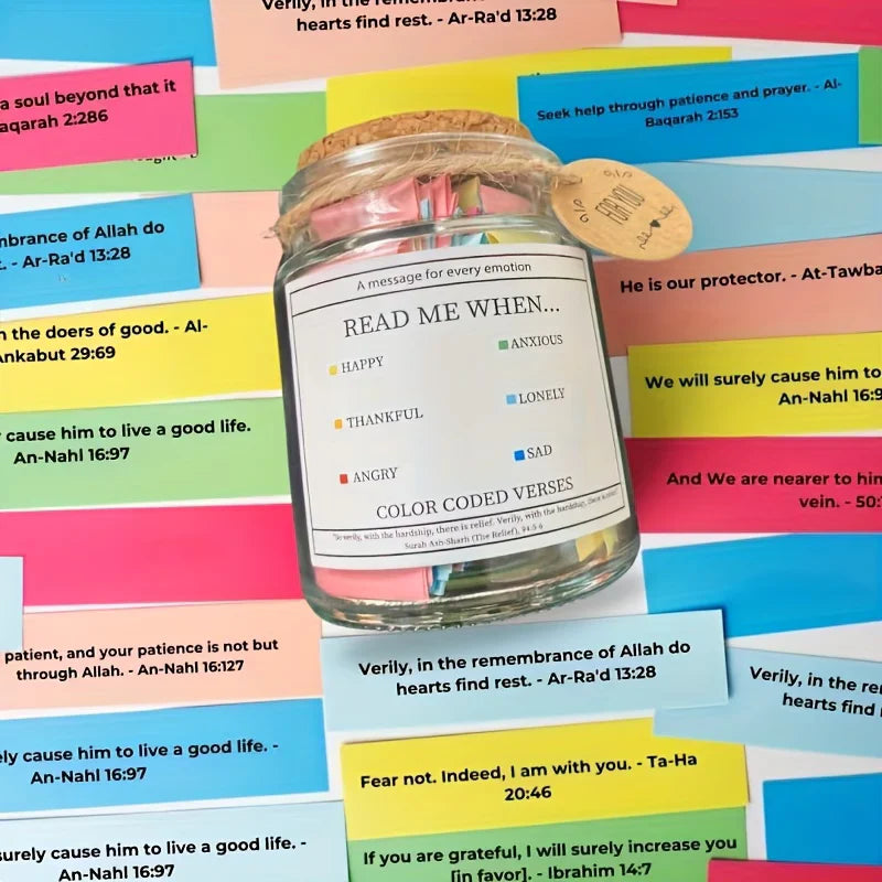 Breng rust, hoop en verdieping in je dagelijkse routine met deze gebedspotjes met Koranverzen. In de ambachtelijke glazen pot vind je zorgvuldig geschreven briefjes met betekenisvolle Koranverzen en spirituele duas—kleine herinneringen die je helpen reflecteren, tot jezelf te komen en je geloof opnieuw te voelen.